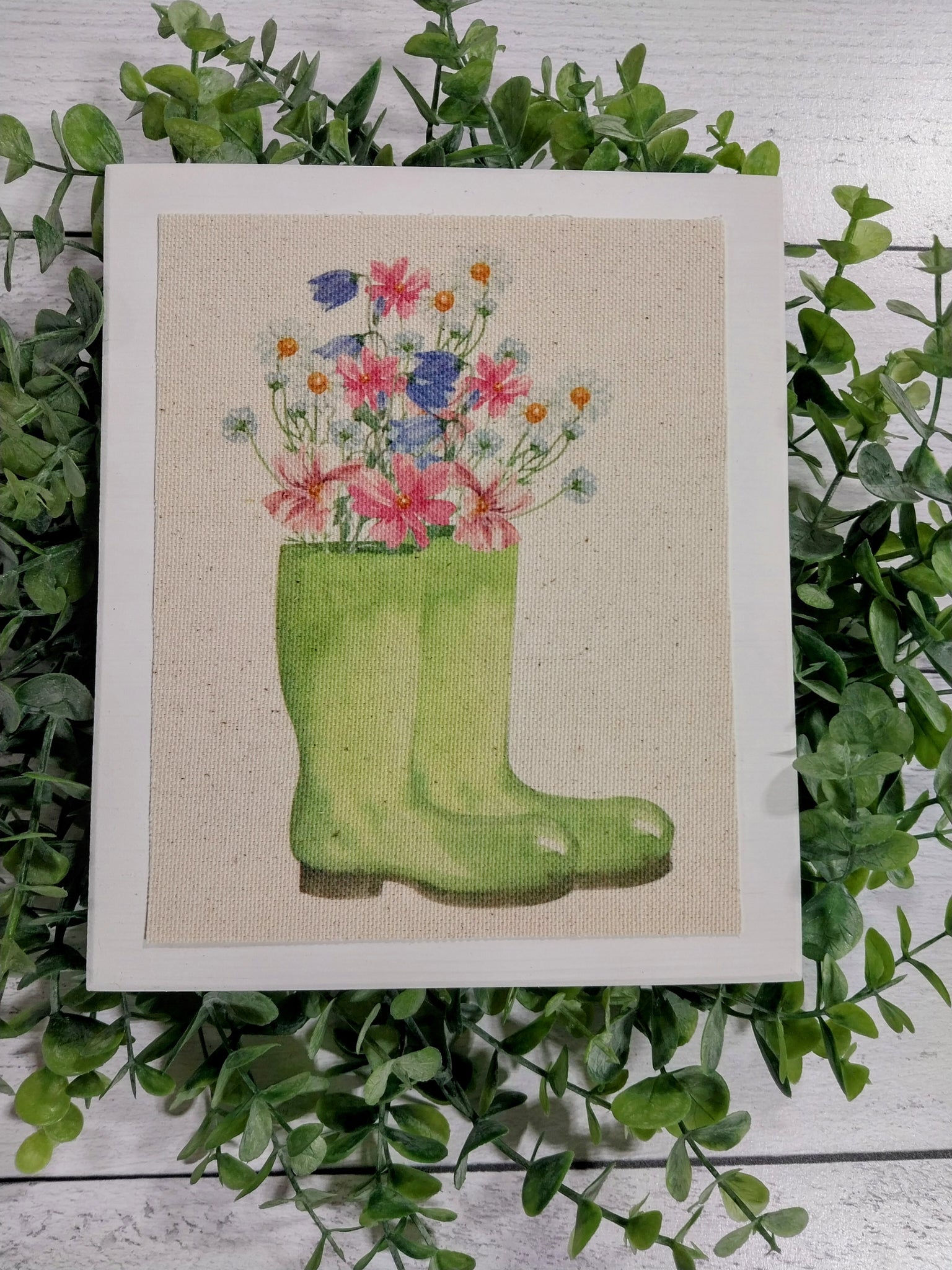 This canvas print of a pair of green rainboots is specifically made for 7.25" x 6" signs, making it an ideal choice for gardening enthusiasts or home decor aficionados.